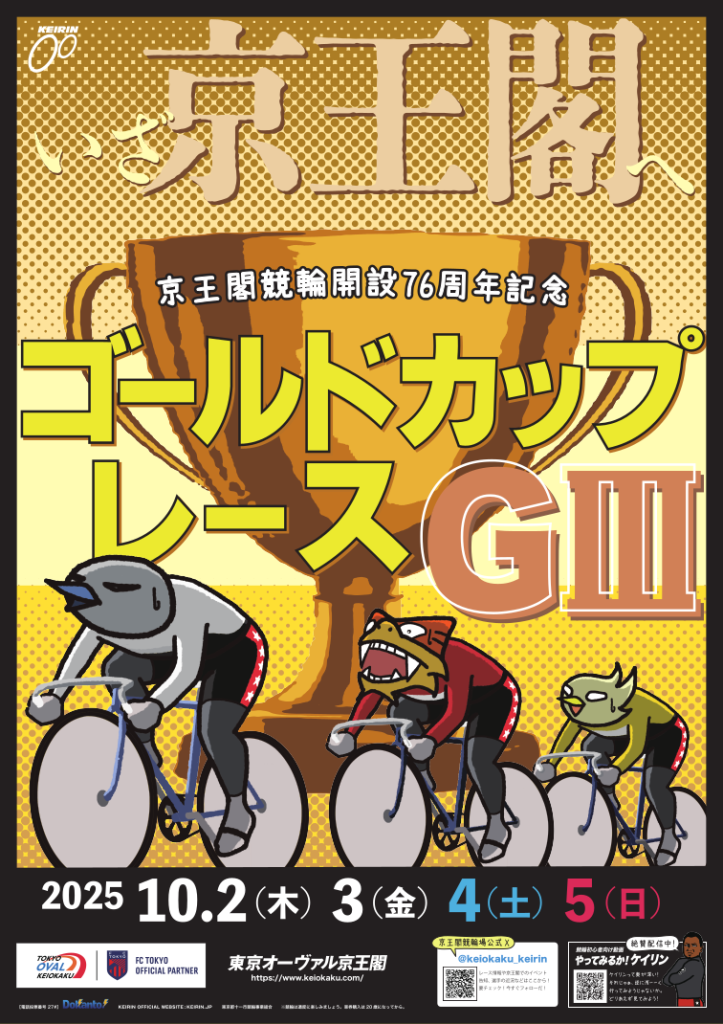 京王閣記念【GⅢ】ゴールドカップレース 2025年9月24日 10月2日(木)~10月5日(日)開催予定 【出場予定選手】※出場予定選手は、欠場などにより変更の可能性もあります。 (SS) 眞杉匠 岩本俊介 脇本雄太 松浦悠士 清水裕友 (注目選手) 吉田拓矢 南修二 菅田壱道 和田健太郎 中本匠栄 伊藤旭 中村圭志 松岡孝高 松尾勇吾 佐藤壮志 他