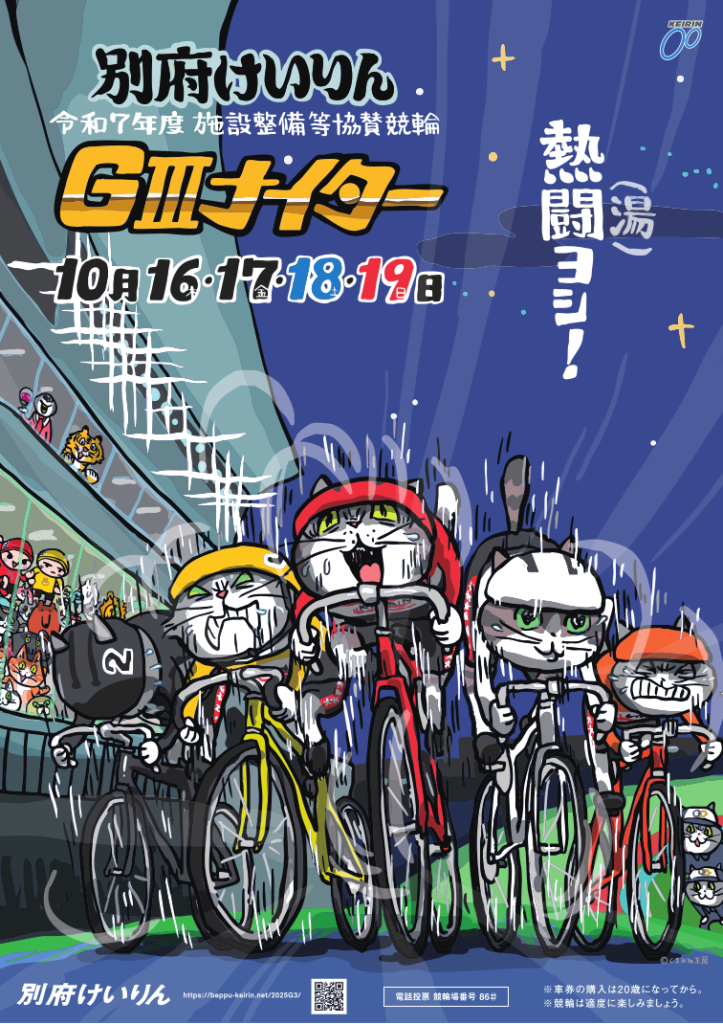 別府競輪【GⅢ】施設整備等協賛競輪 2025年9月24日 10月16日(木)~10月19日(日)開催予定 【出場予定選手】※出場予定選手は、欠場などにより変更の可能性もあります。 (注目選手) 山田庸平 上田国広 小川勇介 中釜章成 木村皆斗 山口富生 伊藤颯馬 阿部将大 新田康仁 武田豊樹 河村雅章 櫻井正孝 藤田勝也 橋本瑠偉 真鍋智寛 長島大介 中川誠一郎 塚本大樹 中村雅仁 森山智徳 他