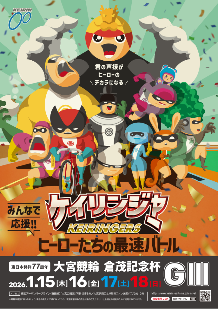 大宮記念【GⅢ】倉茂記念杯 2026年1月2日 1月15日(木)~1月18日(日)開催予定 【出場予定選手】※出場予定選手は、欠場などにより変更の可能性もあります。 (SS) 眞杉匠 寺崎浩平 古性優作 (注目選手) 荒井崇博 松浦悠士 中野慎詞 佐々木龍 山田久徳 武藤龍生 和田圭 北津留翼 佐方良行 田中陽平 本郷雄三 谷口力也 河崎正晴 他