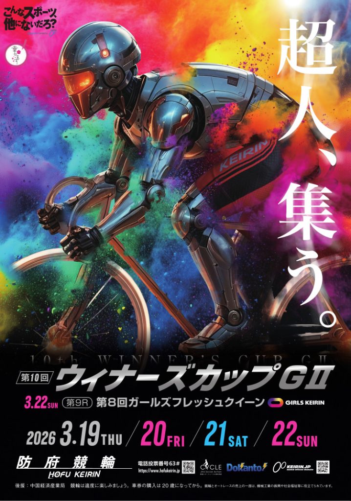 防府競輪【GⅡ】ウィナーズカップ 2026年2月26日 3月19日(木)~3月22日(日)開催予定 【出場予定選手】※出場予定選手は、欠場などにより変更の可能性もあります。 (SS) 阿部拓真 吉田拓矢 眞杉匠 郡司浩平 脇本雄太 寺崎浩平 南修二 古性優作 嘉永泰斗 (注目選手) 山口拳矢 松井宏佑 松本貴治 荒井崇博 塚本大樹 東矢圭吾 他